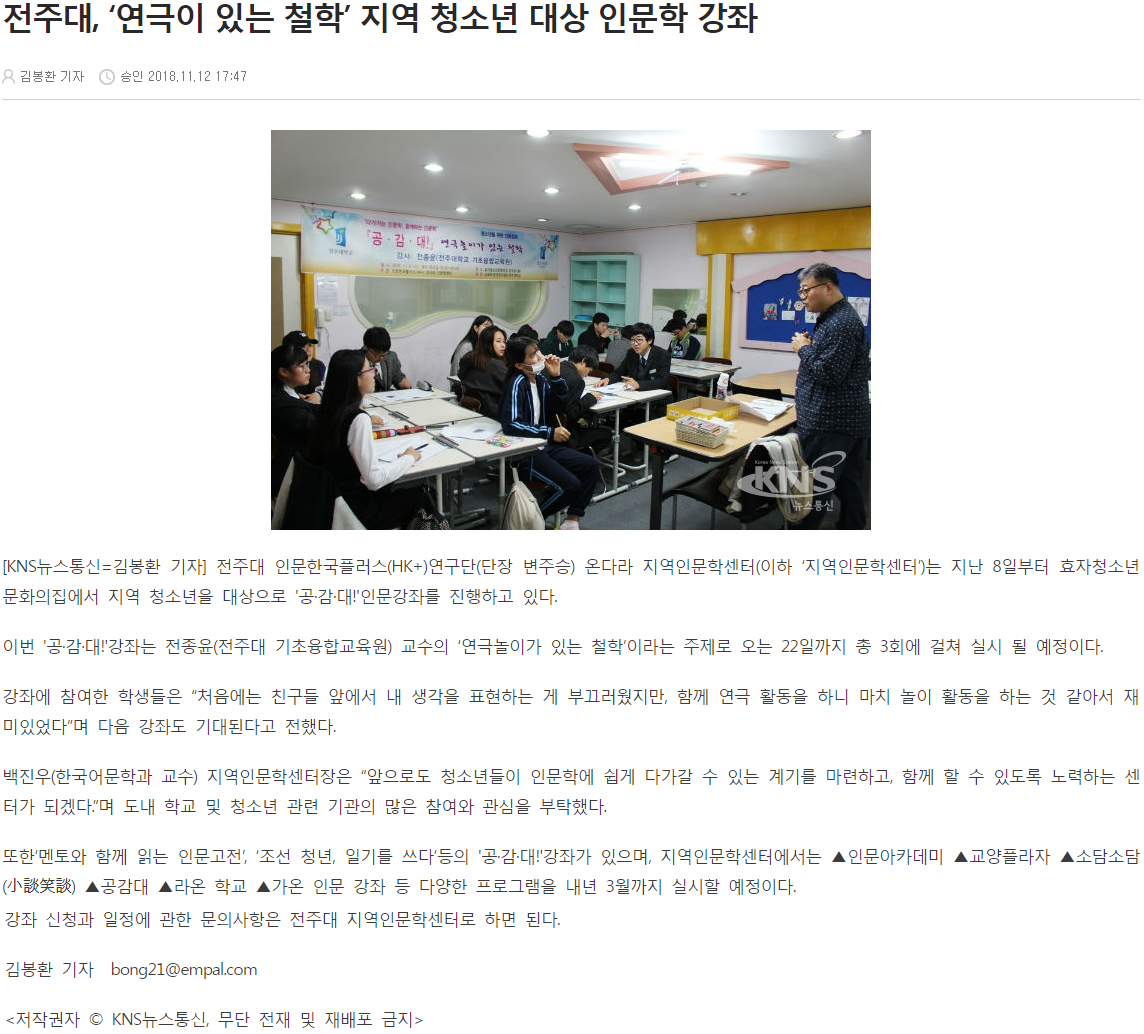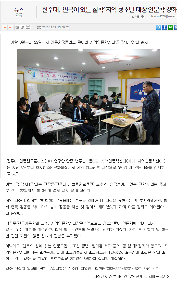 | 105 | 기타 | 전주대, ‘연극이 있는 철학’ 지역 청소년 대상 인문학 강좌 | 온다라 지역인문학센터 | 19-08-10 | 240 |