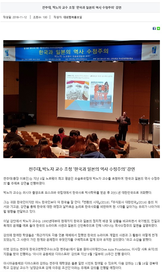 전주대, 박노자 교수 초청 ‘한국과 일본의 역사 수정주의’ 강연