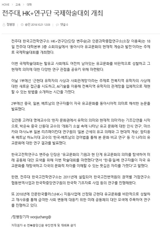 전주대, HK+연구단 국제학술대회 지난 18일 개최