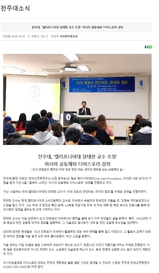 전주대, ‘캘리포니아대 장태한 교수 초청’ 아시아 공동체와 디아스포라 강좌