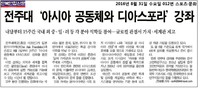 | 5 | 원 아시아 재단 지원 강좌 "아시아 공동체와 디아스포라" 신문보도자료 | 박성우 | 16-08-31 | 559 |