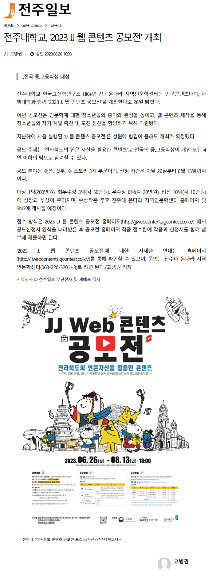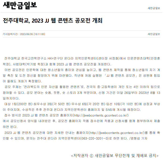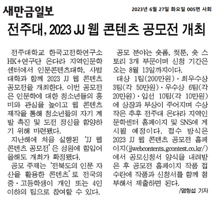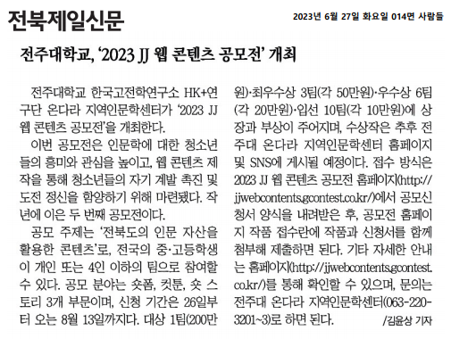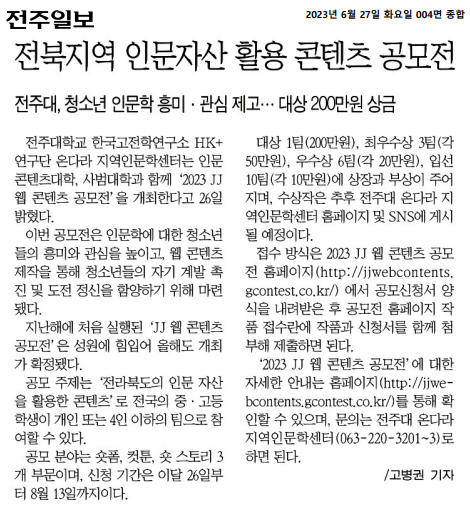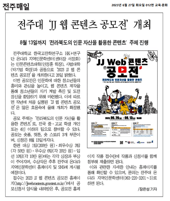 | 675 | 기타 | 전주대, 2023 JJ 웹 콘텐츠 공모전 개최 | 온다라 지역인문학센터 | 23-07-18 | 289 |